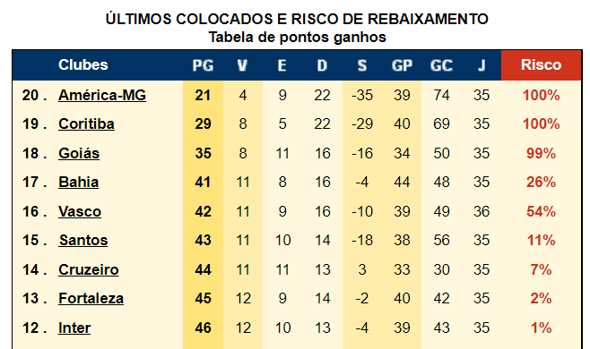 Infobola diz que o Vasco tem 54% de chance de rebaixamento