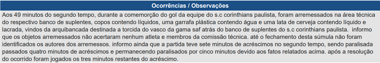 29/11/23 - Confira a súmula de Vasco 2 x 4 Corinthians, pelo Brasileiro