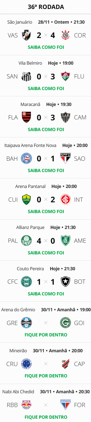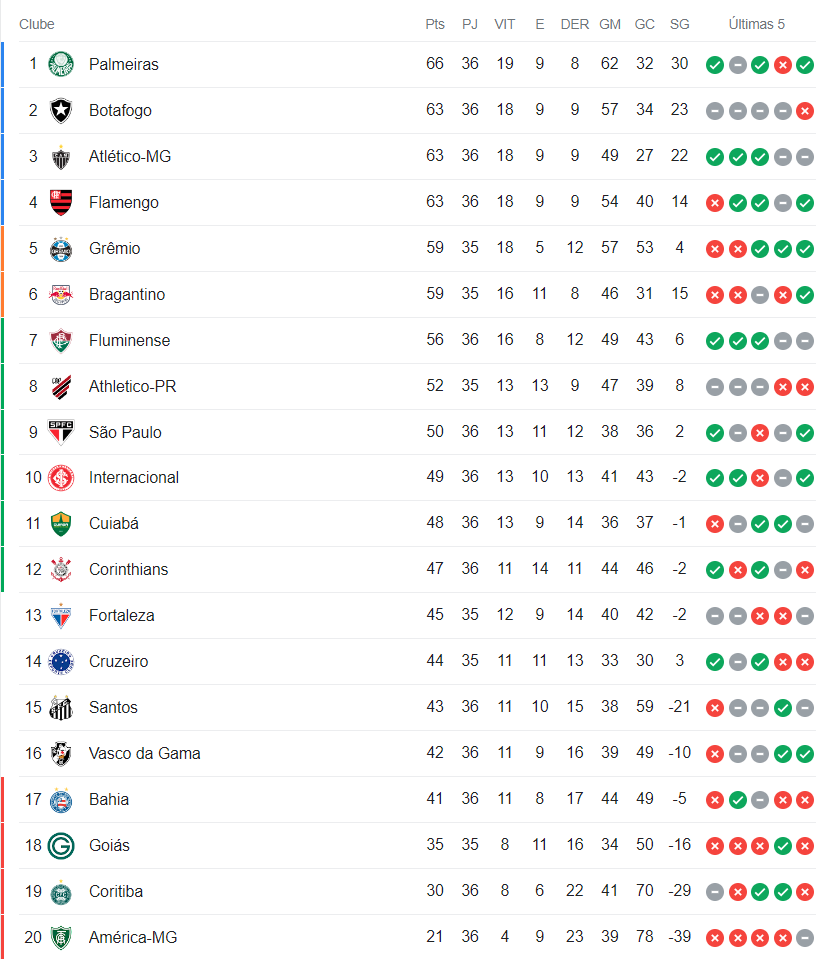 Veja a classificação do Brasileiro após os jogos de 4ª-feira da 36ª rodada