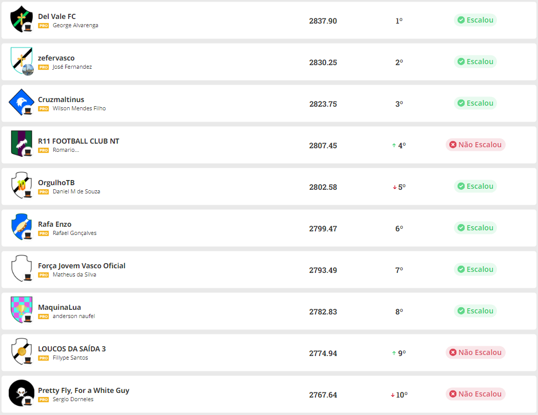 31/10/23 - Cartola: Confira a classificação da Liga NETVASCO após a 30ª rodada
