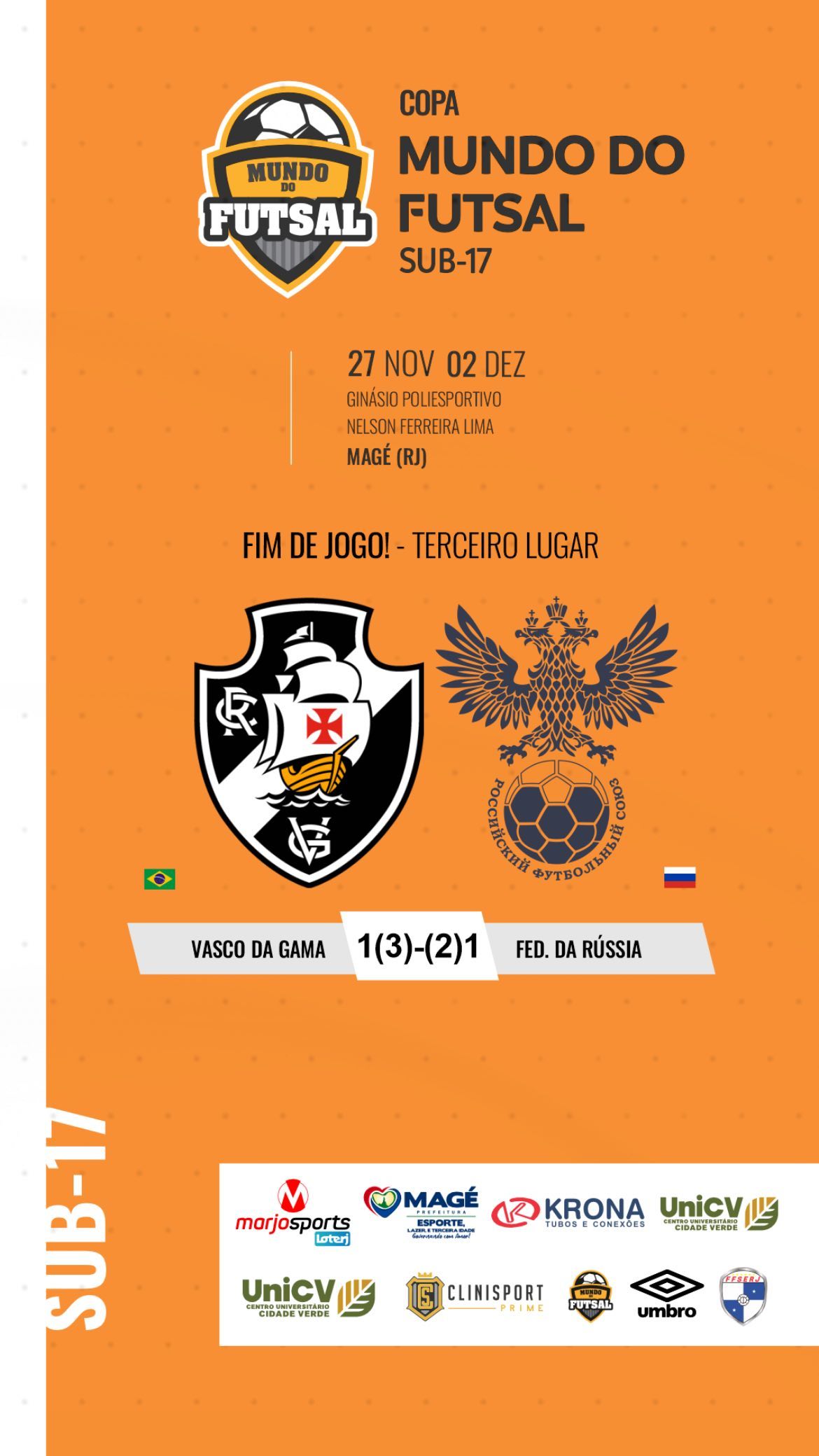 O Vasco derrotou a Federação da Rússia nos pênaltis, após empate por 1 a 1 no tempo normal, na manhã deste sábado no Ginásio Poliesportivo Nelson Ferreira Lima, em Magé (RJ), e terminou a Copa Mundo do Futsal Sub-17 na 3ª colocação.
