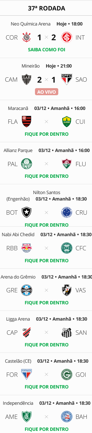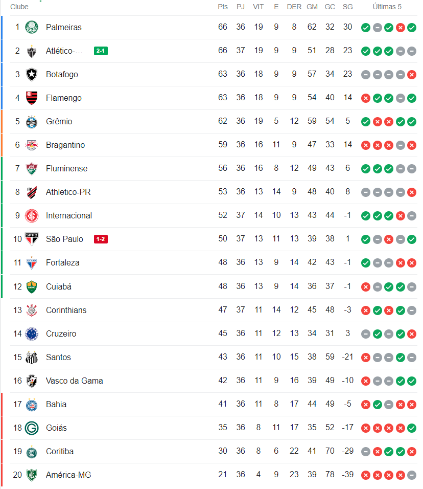 Veja a classificação do Brasileiro após os jogos de sábado da 37ª rodada