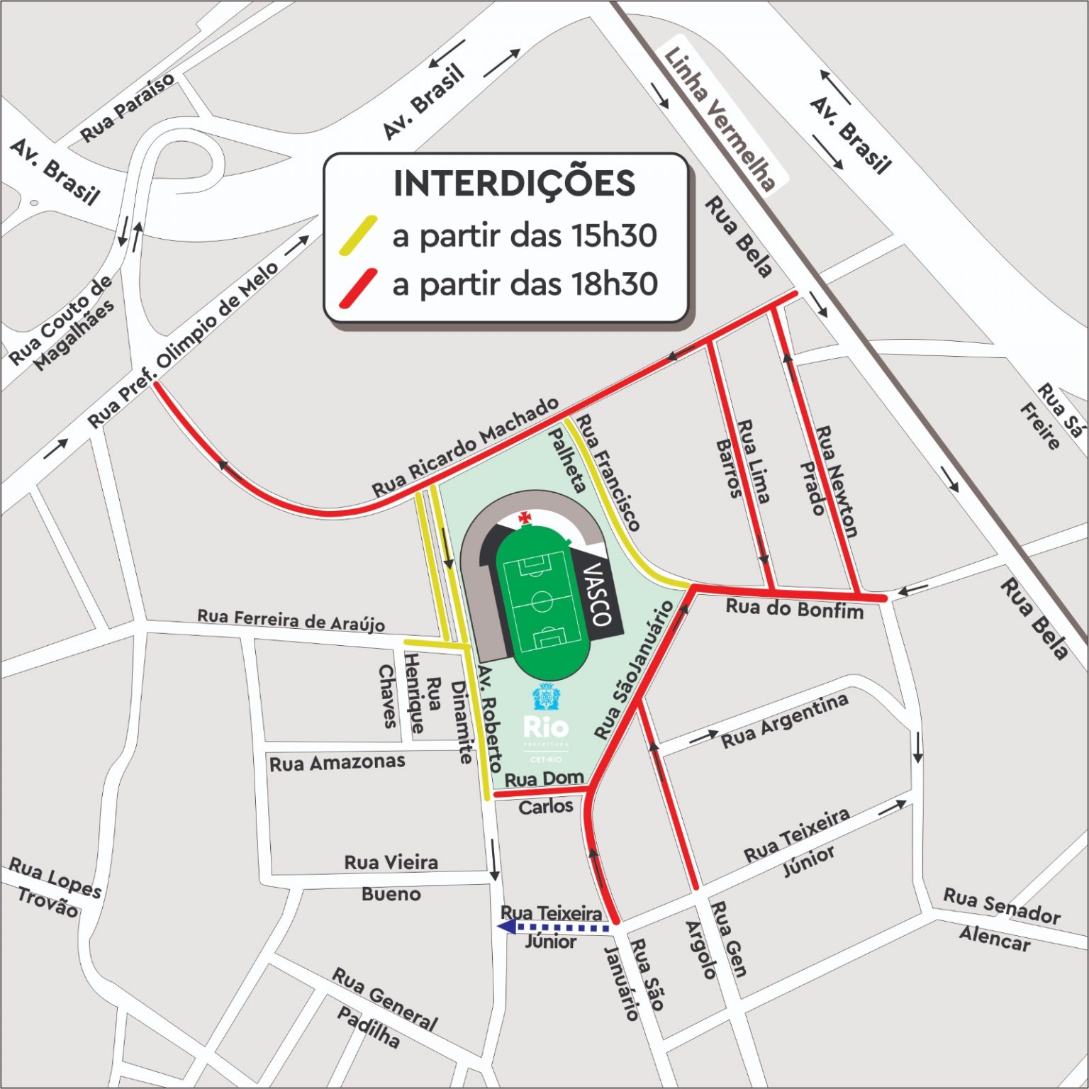 A CET-Rio montou um esquema especial de tráfego para o jogo entre Vasco e Bragantino, nesta quarta-feira (6/12), às 21h30, no Estádio São Januário, pelo Campeonato Brasileiro. Para atender ao evento, diversas vias no entorno do estádio serão interditadas: