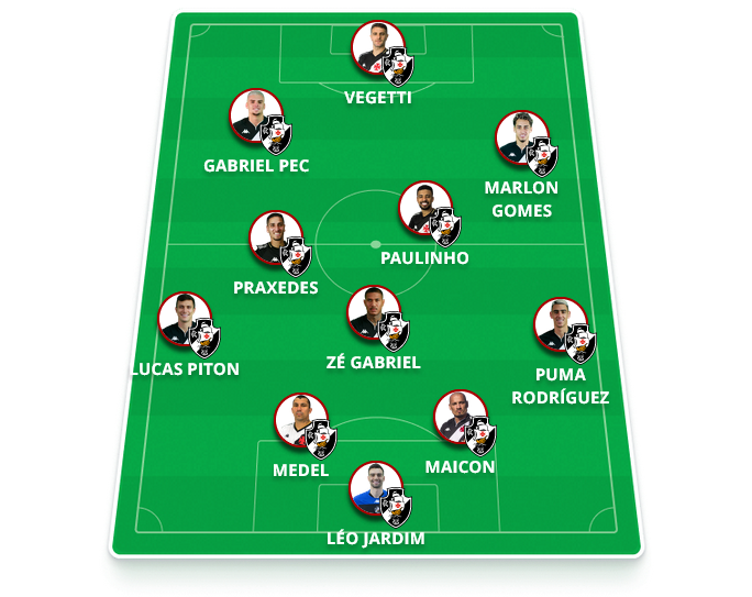 Provável time: Léo Jardim, Puma, Maicon, Medel (Léo), Lucas Piton, Zé Gabriel, Praxedes (Jair), Paulinho, Marlon Gomes, Gabriel Pec e Vegetti.