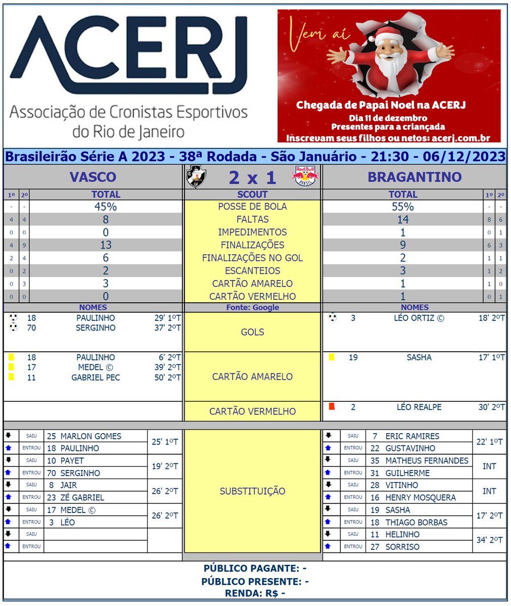 O Vasco abriu o placar no primeiro tempo, com Paulinho. Só que na etapa final, o Bragantino chegou ao empate, com Léo Ortiz. O gol da vitória cruzmaltina veio com Serginho.