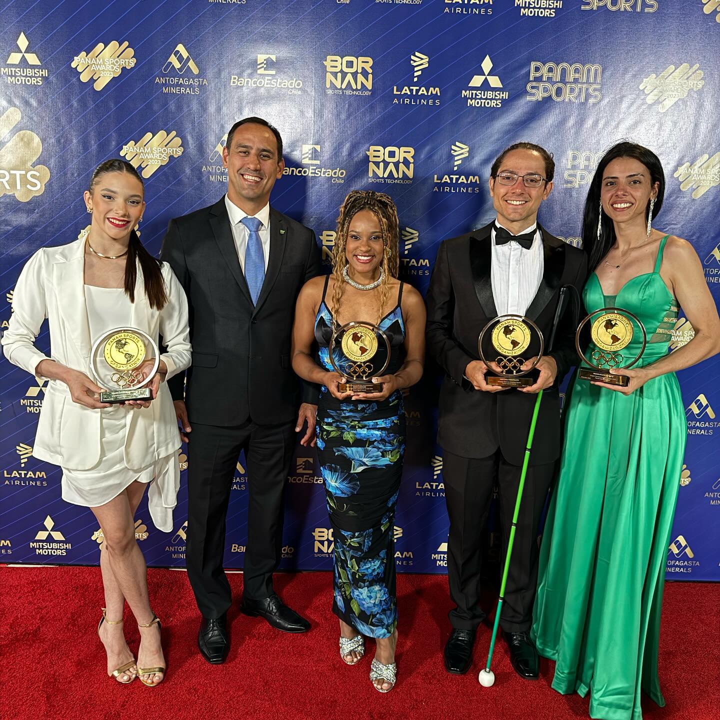 Noite de gala em Miami! Três brasileiros conquistaram troféus na cerimônia Panam Sports Awards. Nesta noite de sábado, Rebeca Andrade foi eleita o destaque dos Jogos Pan-Americanos de Santiago 2023. Maria Eduarda Alexandre com voto popular levou o prêmio de Legado dos Jogos Pan-Americanos da Juventude Cali-2021. Já Douglas Matera foi eleito o melhor atleta dos Jogos Parapan-Americanos.