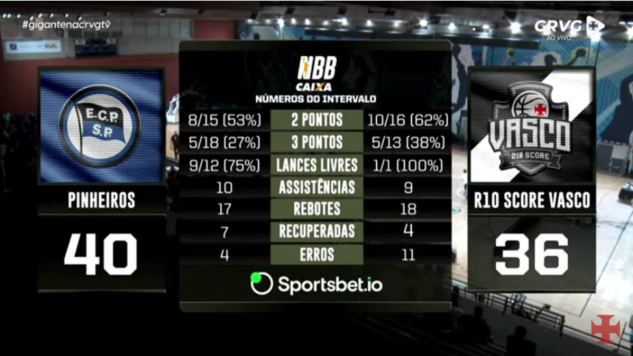 20:48 - Basquete: Intervalo; Vasco vai perdendo para o Pinheiros por 40 a 36