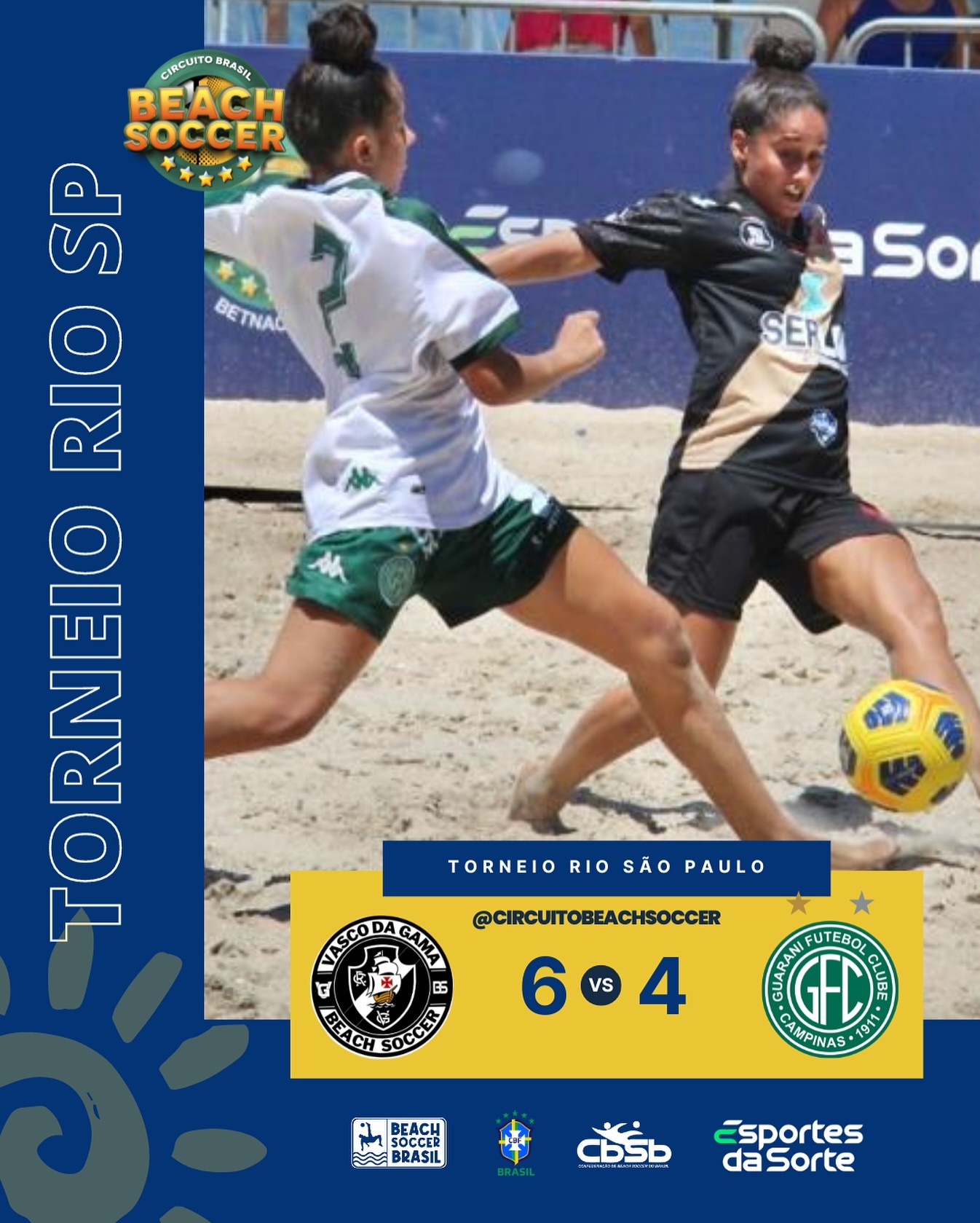 O Vasco venceu o Guarani por 6 a 4 neste sábado pelo Torneio Rio-São Paulo de Beach Soccer Feminino. Com o resultado, as vascaínas ficaram em 3º lugar na competição.
