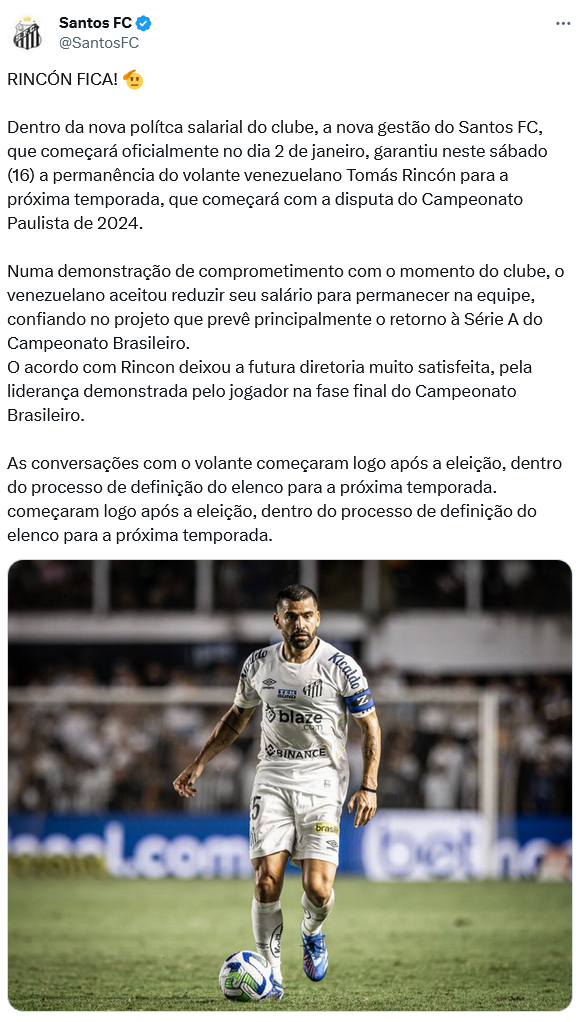 Na tarde deste sábado, o Santos oficializou a permanência do volante Rincón para a próxima temporada. Alvo de alguns clubes, inclusive o Vasco, o venezuelano aceitou uma redução salarial para ficar no Peixe.