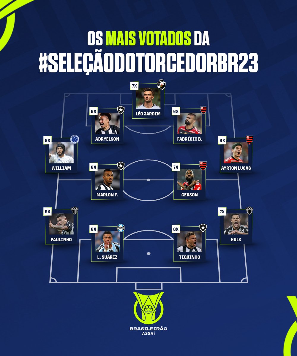 Durante as 38 rodadas do #CampeonatoDoBrasileiro, você votou aqui no Twitter e escolheu os onze jogadores para a #SeleçãoDoTorcedorBR23! Esse aí seria um timaço, hein! 🇧🇷