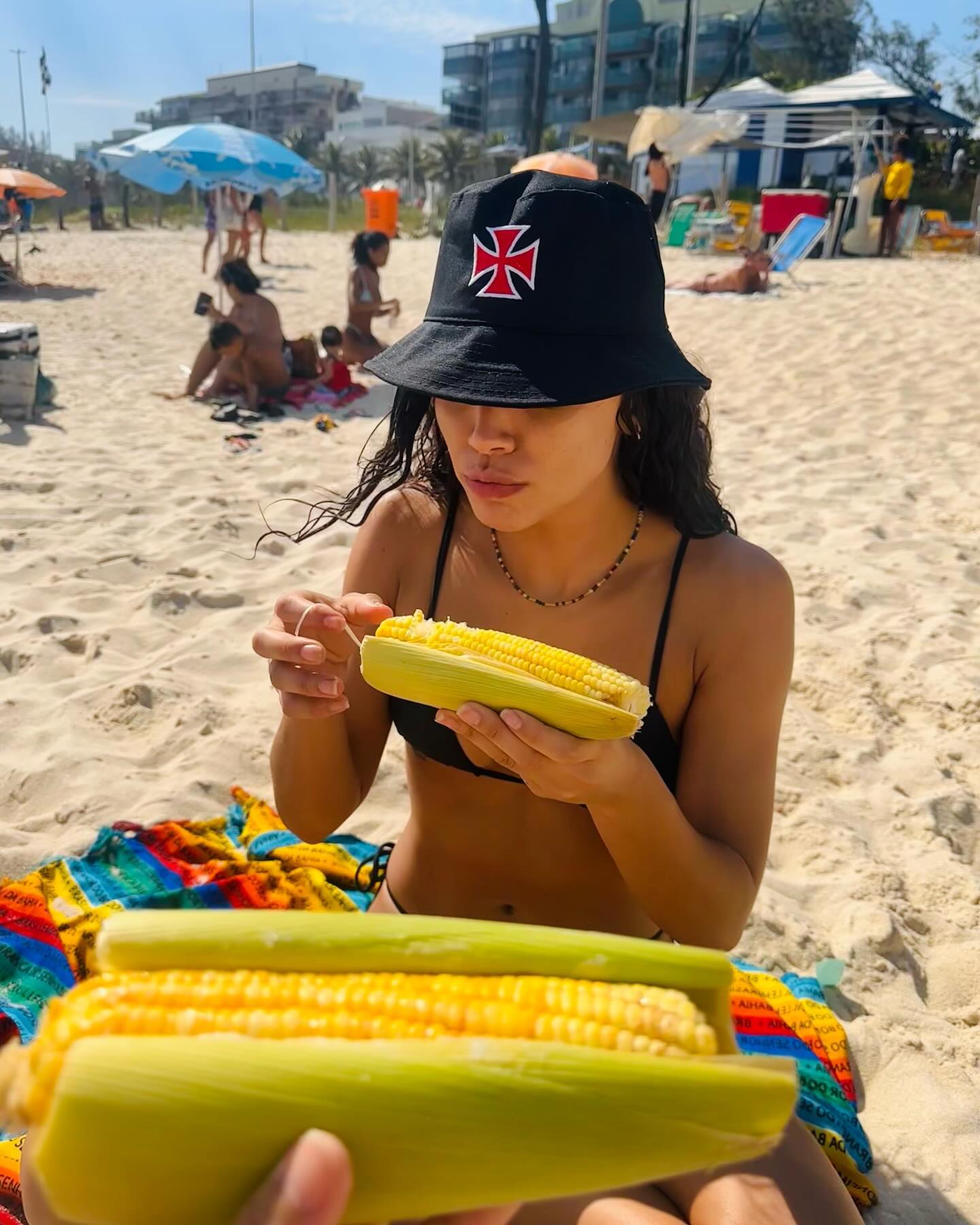 Atriz Giovana Cordeiro, da novela 'Fuzuê', usa chapéu do Vasco na praia