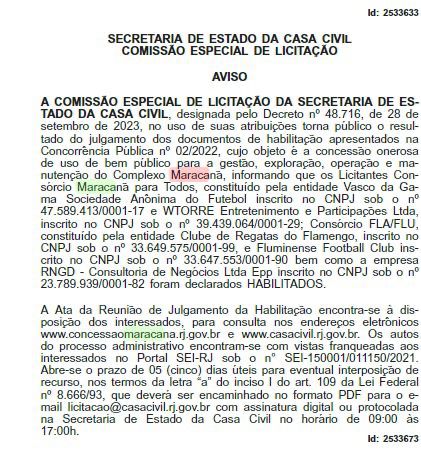 Enquanto a licitação não termina, o estádio continua sendo gerido por Flamengo e Fluminense, graças a uma permissão de uso assinada com o governo. Isso também foi registrado pelo Diário Oficial hoje (19).