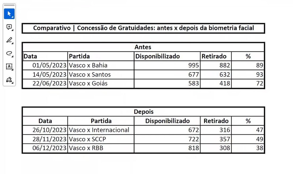 Em maio de 2023, antes da instalação das câmeras de biometria facial, em uma partida entre Vasco e Bahia, foram retirados 882 ingressos de gratuidade. Após a instalação da tecnologia, no jogo entre Vasco e Internacional, foram concedidos 316 ingressos.