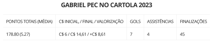 O Vasco fez turnos completamente distintos no Brasileirão. Após uma primeira metade do campeonato com apenas 16 pontos ganhos e um 18º lugar na tabela, o Gigante da Colina se recuperou e fez campanha de 7º colocado no returno - o que o livrou do rebaixamento. Gabriel Pec, maior pontuador do Vasco no Cartola 2023, contudo, manteve sua regularidade, com média de 5.27 pontos por jogo e um acumulado de 178.80.
