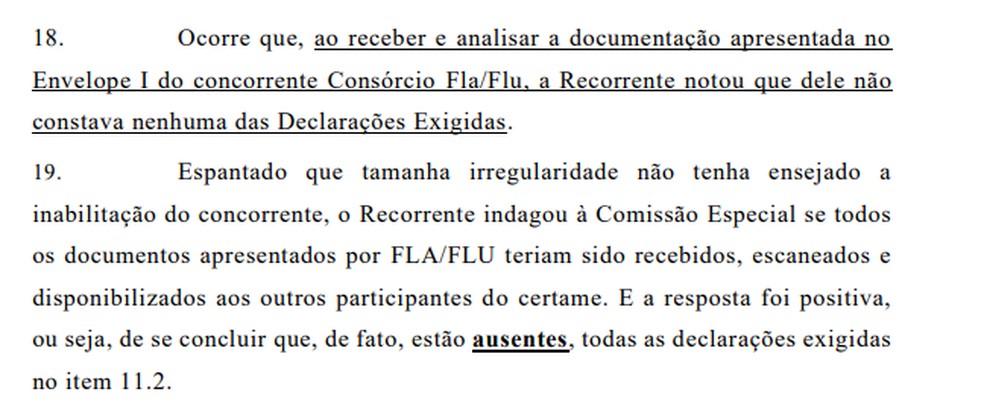 No clássico pelo Maracanã, o consórcio de Flamengo e Fluminense fez também série de questionamentos para inabilitar os vascaínos e seus parceiros da disputa. De acordo com o recurso, os concorrentes apresentaram "garantia de proposta irregular" e também apresentaram, de maneira irregular ao pedido no edital, atestado de capacidade técnica em gestão da operação e manutenção de estádio de futebol e de arena multiuso ou de ginásio esportivo, entre outros pontos.