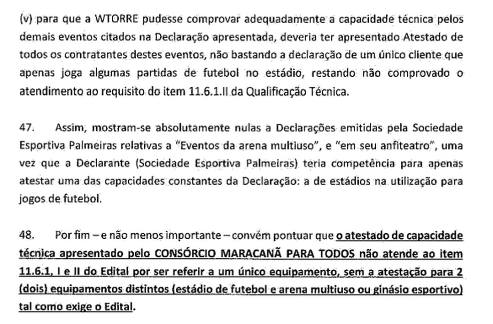 Contra a dupla Fla-Flu, o atestado de capacidade técnica, entendem os advogados do grupo de Brasília, não demonstra "a necessária capacidade técnica relacionada à manutenção" do Complexo Maracanã. O grupo cita as constantes renovações de TPU como fator dificultador de planejamento para cuidados no Maracanã e no Maracanãzinho.