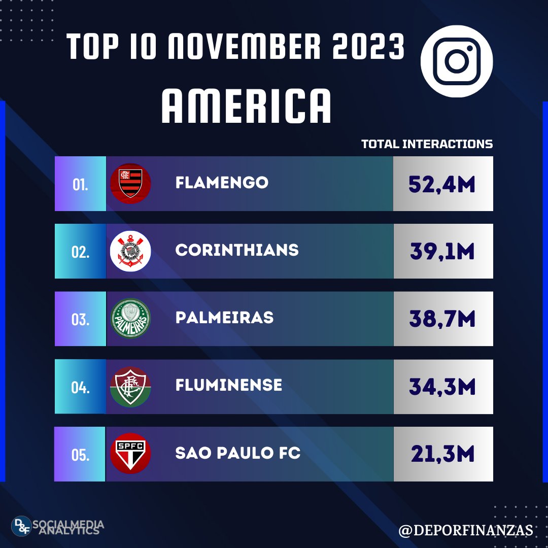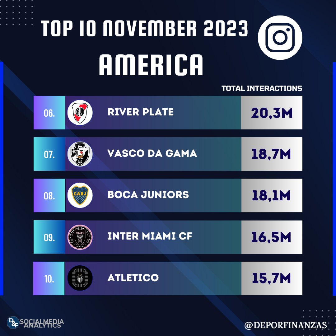 📲⚽ ¡Los 10 clubes de América con más interacciones en #instagram durante noviembre 2023!💙💬