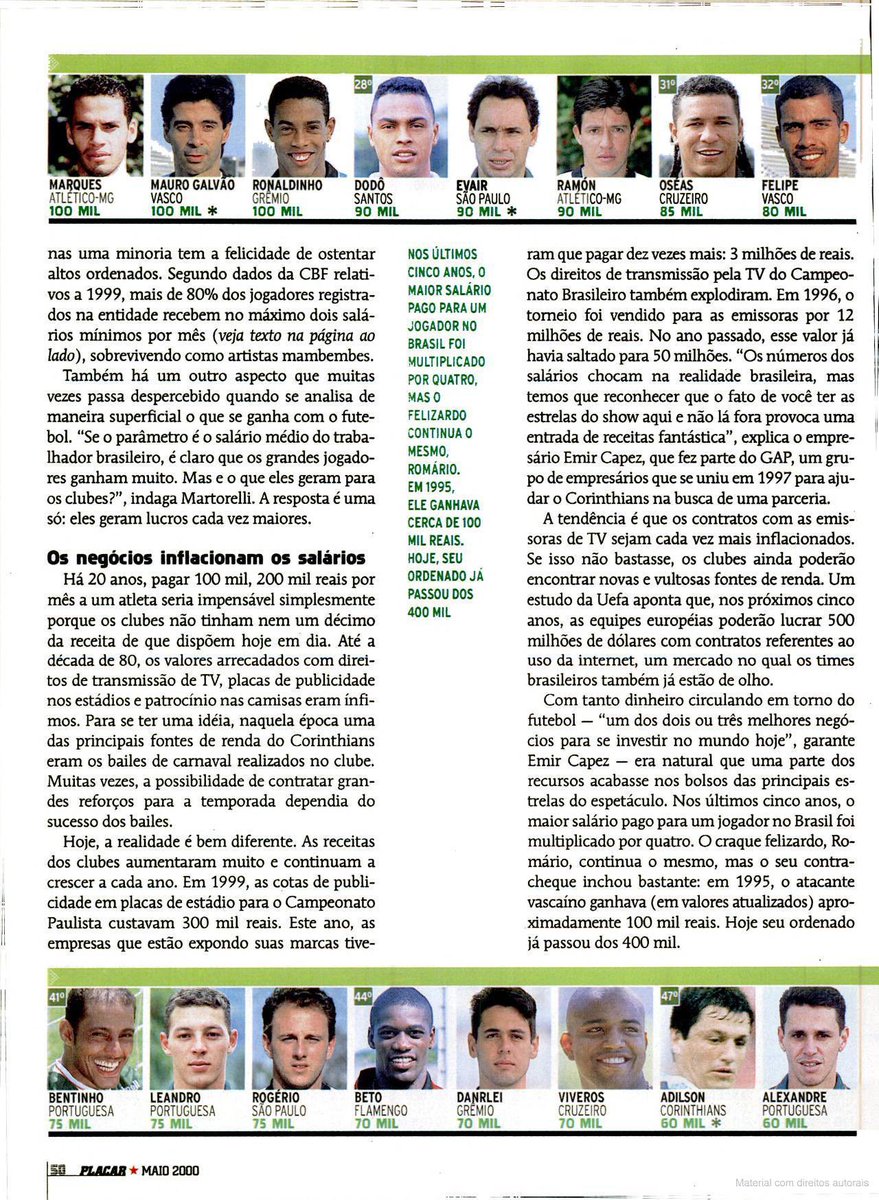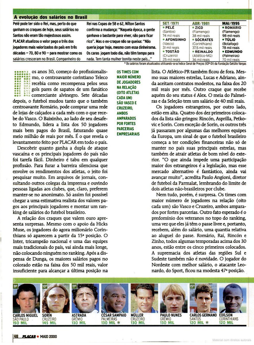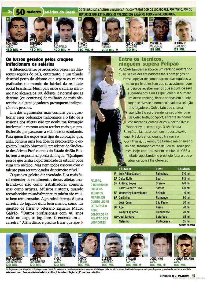 Os 50 maiores salários de jogadores do futebol brasileiro em 2000 pela Revista @placar .
