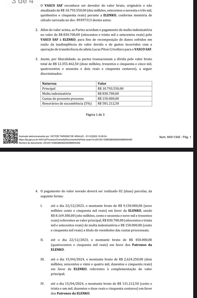 Aproveitar o engajamento da torcida do Corinthians para alertar aos amigos que o Vasco pagou integralmente a dívida que tinha com a Elenko Sports. O pagamento de mais de 12 milhões de reais foi realizado no dia 22/12/2023. Segue o acordo celebrado entre as partes: