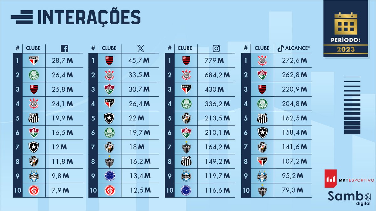 @SaoPauloFC, @Flamengo e @Corinthians lideraram em presença nas redes sociais entre engajamento (Facebook, X e Instagram) e alcance (TikTok).