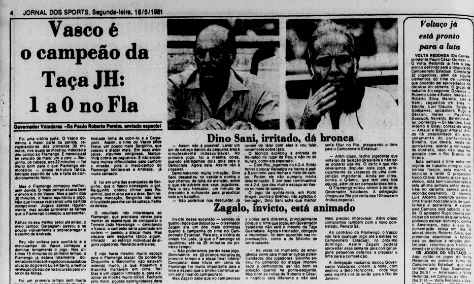 Em 17 de maio de 1981, o Vasco derrotou o Flamengo por 1 a 0, gol de Serginho, e conquistou a Taça João Havelange, torneio amistoso disputado em Governador Valadares (MG). Esse foi um dos títulos de Zagallo como treinador do Gigante da Colina. Zagallo faleceu na última sexta-feira aos 92 anos.