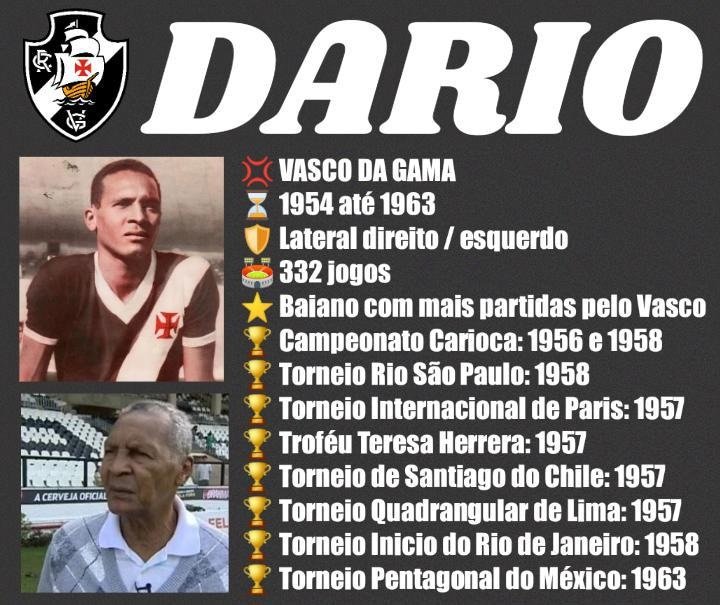 Há 92 anos nascia Dario Damasceno, o ex-lateral Dario! Era aplicado e dos baianos que jogaram no Vasco, ele é o que tem mais jogos no clube! Em 2012 na TV Globo (matéria da Final de Paris 1957) falou da paixão e orgulho pelo Vasco ‘Não há clube igual'. Faleceu 2017.
