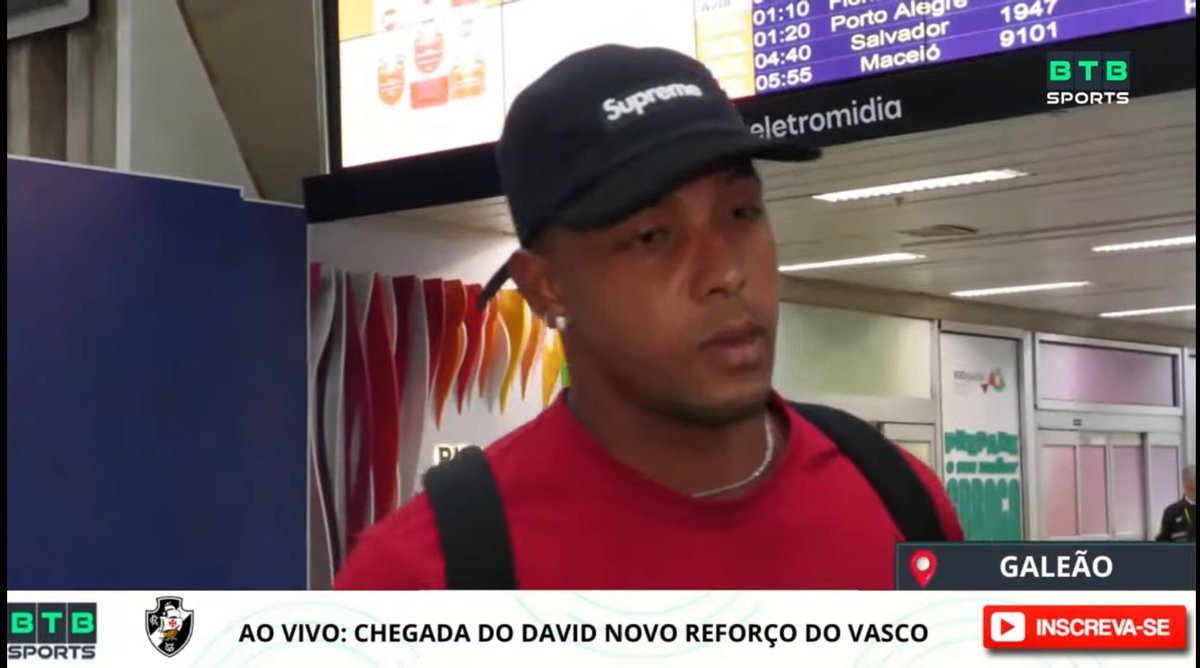 Terceiro reforço do Vasco para 2024, David desembarcou no Rio de Janeiro na noite deste domingo, no Aeroporto do Galeão, e se disse feliz e otimista com a chegada ao novo clube.