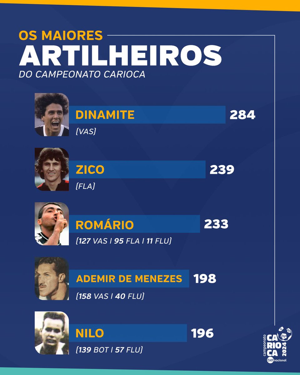 Roberto Dinamite é o maior artilheiro da história do Campeonato Carioca; Romário é o 3º e Ademir é o 4º