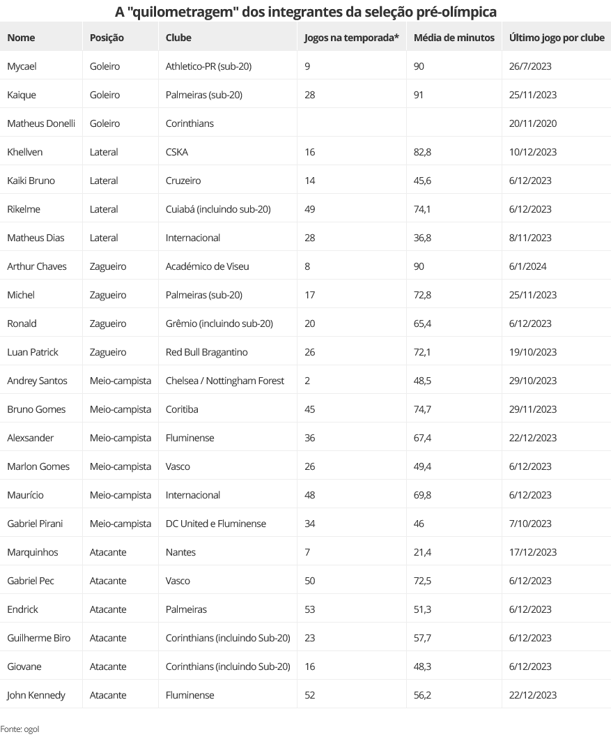 Endrick vem de mais de 50 jogos em 2023 pelo Palmeiras. Arthur Chaves está no ponto alto da temporada em Portugal. Marquinhos tem média de cerca de 20 minutos em campo. Matheus Donelli não faz uma partida oficial pelo Corinthians desde 2020. A seleção brasileira se apronta para o Torneio Pré-Olímpico com jogadores em condições físicas e de ritmo bem diferentes, o que tem exigido adaptações nos treinos.