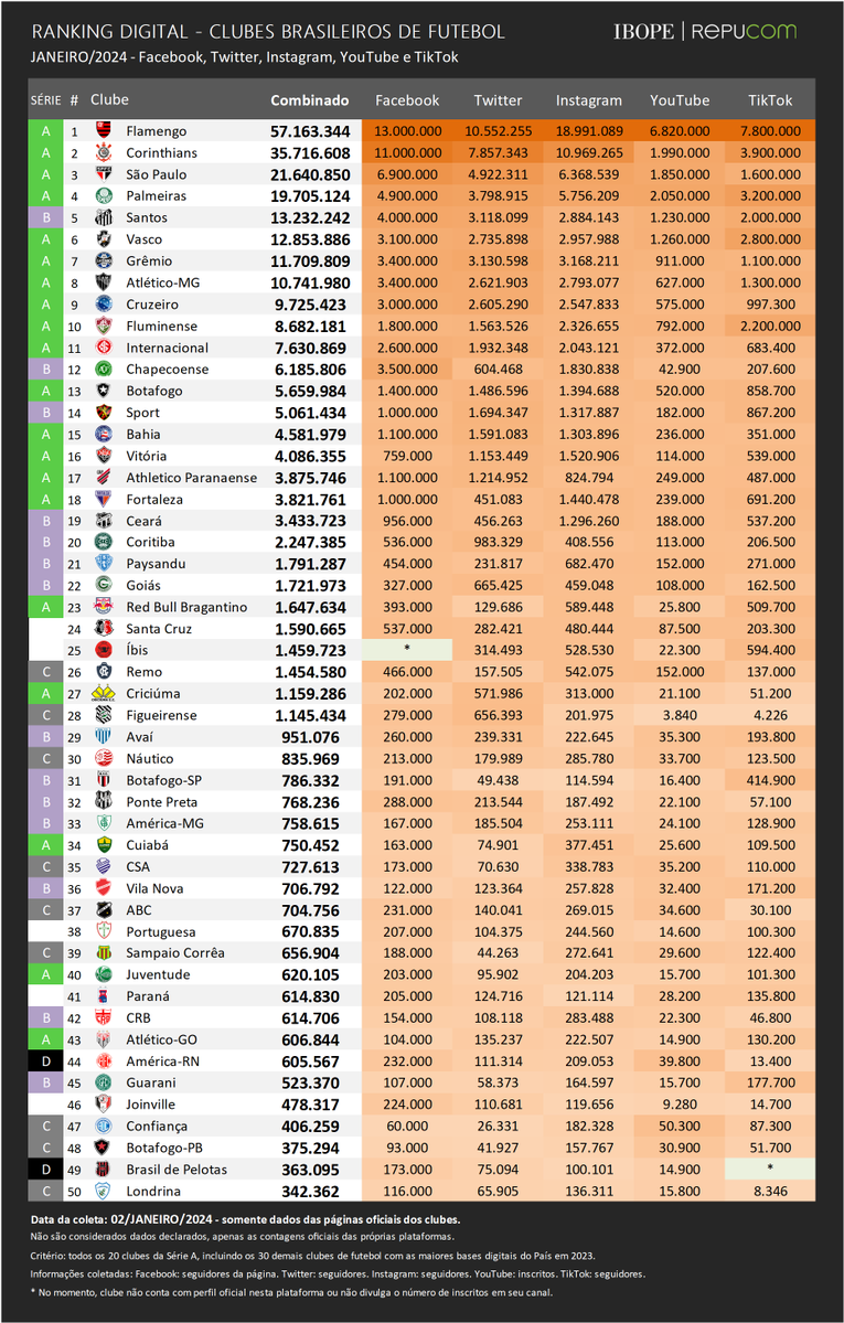Clubes com mais seguidores nas redes sociais em janeiro de 2024 (milhões de usuários):