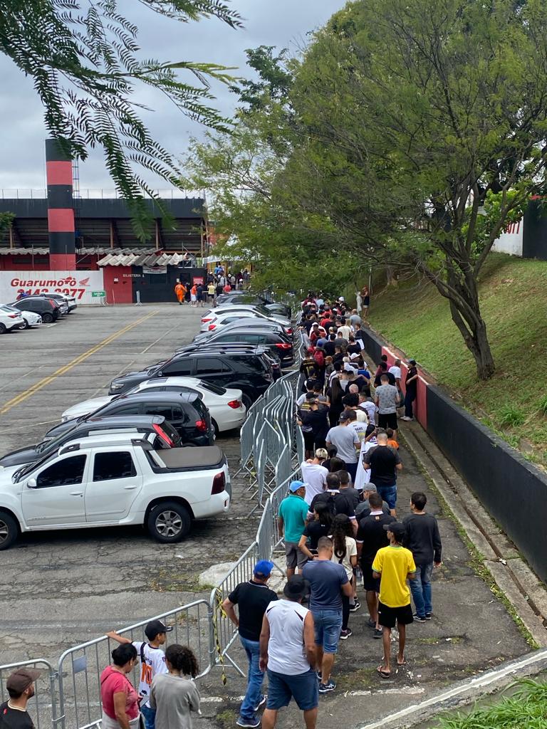 Ainda há uma grande fila para entrar no Estádio Ninho do Corvo, em Guarulhos-SP, para assistir Vasco x Vitória. Essa galera é para o espaço da torcida vascaína.