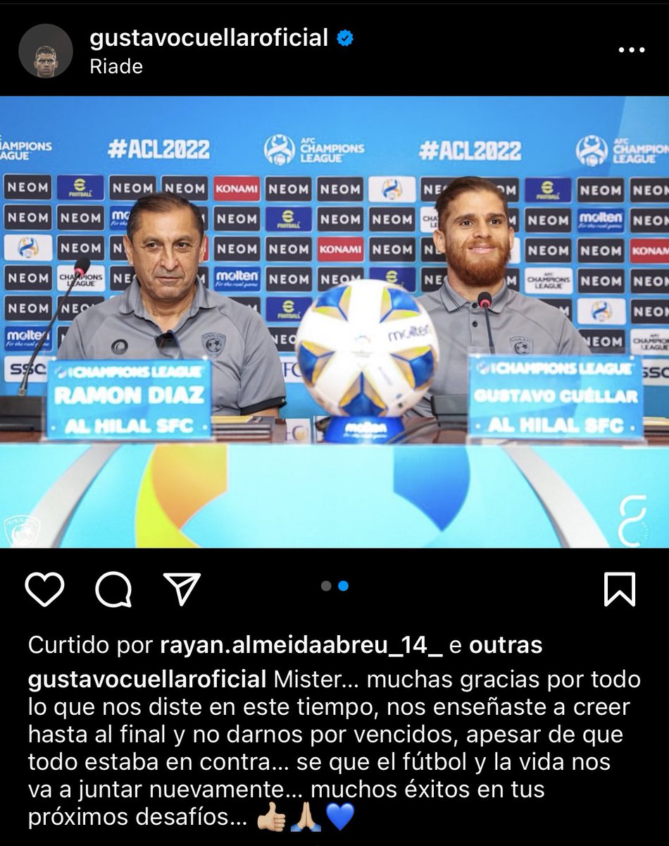 Essa foi a frase de Cuéllar em seu texto de despedida para Ramón Díaz quando o argentino deixou o Al-Hilal.