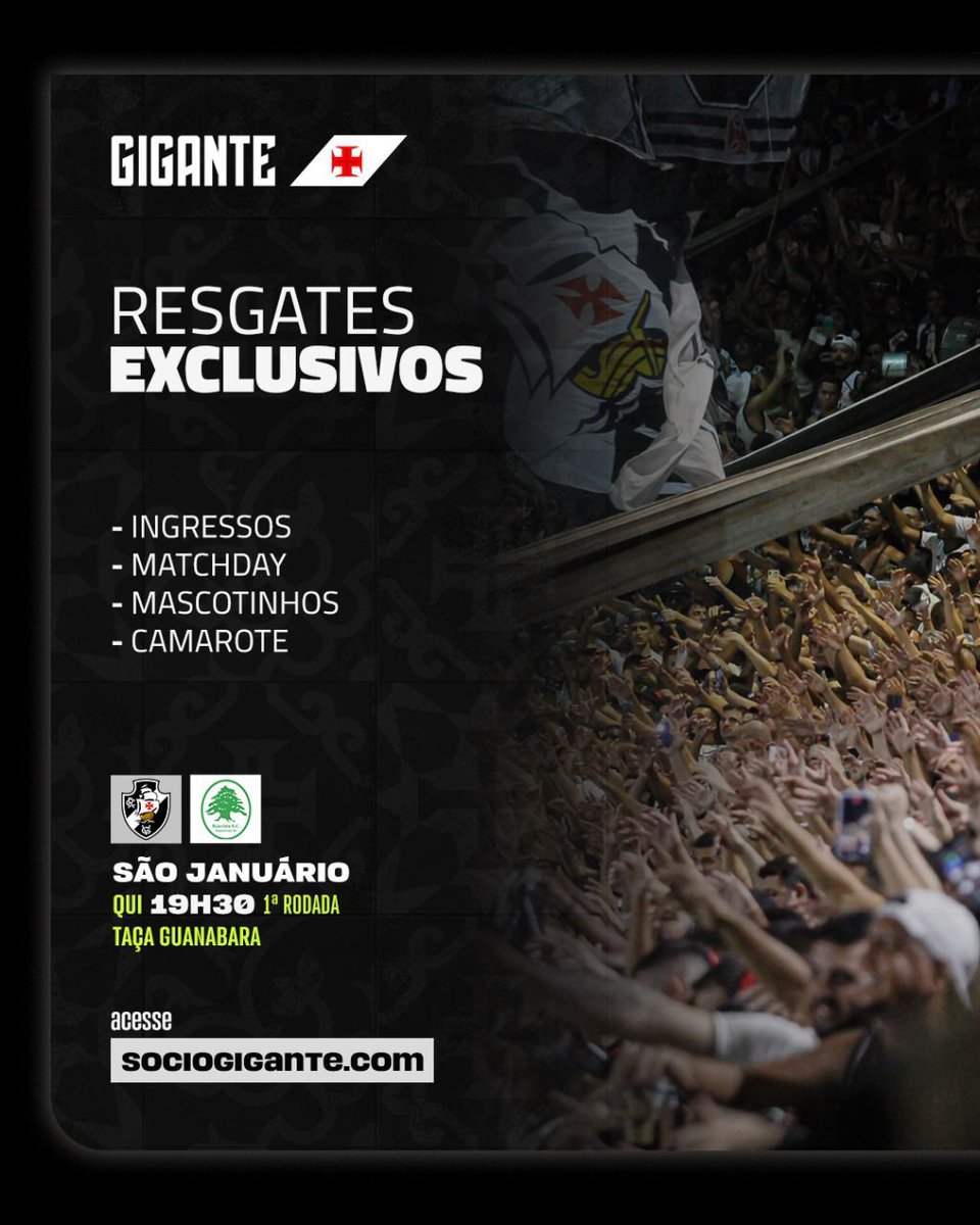 Sócio Gigante terá resgate de ingressos e experiências para Vasco x Boavista a partir das 17h desta 4ª-feira