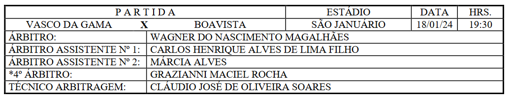Para o jogo Vasco x Boavista hoje, em São Januário, às 19h30, o árbitro será Wagner do Nascimento Magalhães (foto). Os auxiliares serão Carlos Henrique Alves de Lima Filho e Márcia Alves.