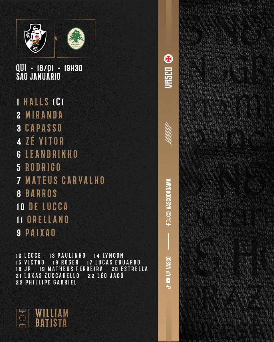 Confira a escalação do Vasco para o jogo contra o Boavista; goleiro Halls é o capitão
