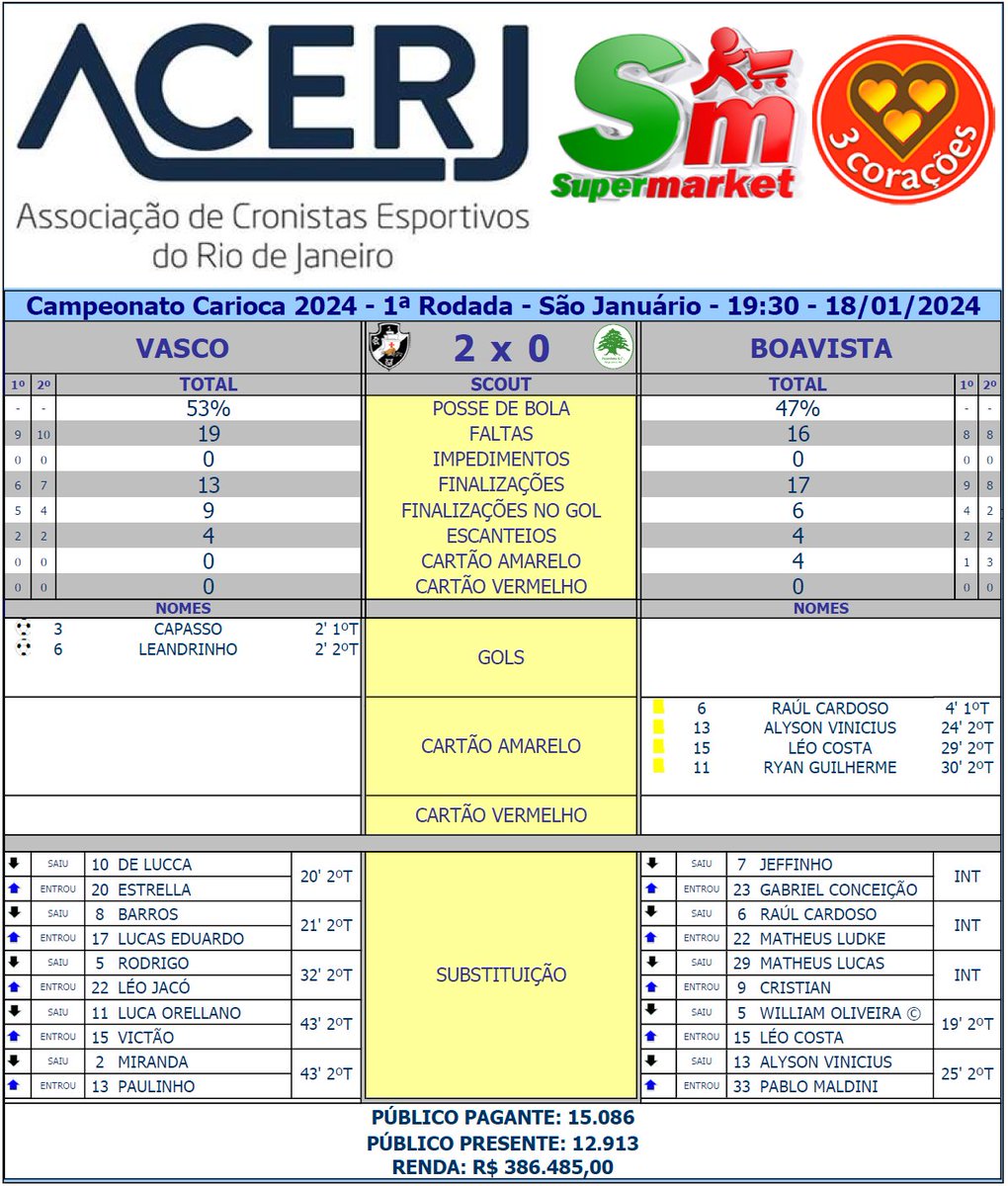 VASCO: Halls; Miranda (Paulinho, 46'/2ºT), Capasso (Victão, 46'/2ºT), Zé Vitor e Leandrinho; Rodrigo (Léo Jacó, 35'/2ºT), Barros (Lucas Eduardo, 23'/2ºT), Matheus Carvalho e De Lucca (Estrella, 23'/2ºT); Orellano e Paixão. Técnico: William Batista.