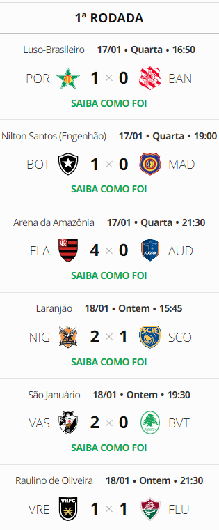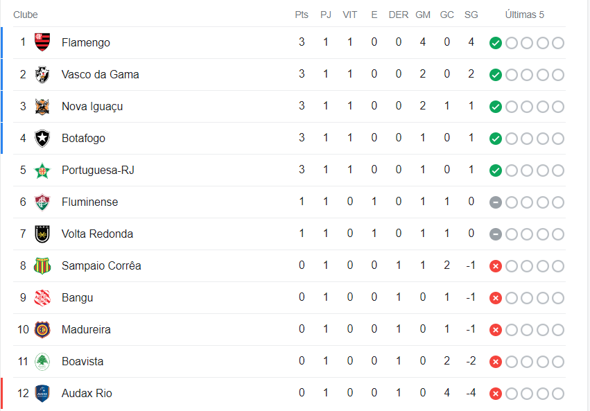 Terminada a 1ª rodada da Taça Guanabara, o Vasco está na 2ª colocação, empatado em pontos com o líder. Os 4 primeiros colocados se classificam para as semifinais do Campeonato Carioca.