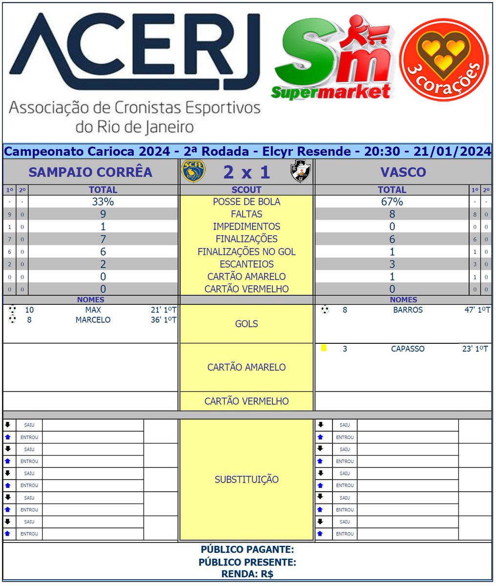 Scout do 1º Tempo de Sampaio Corrêa e Vasco pela 2ª Rodada do Campeonato Carioca 2024 em Bacaxá #Acerjinforma #Cariocao #SCOxVAS #SampaioCorreaRJ #Vasco @Cariocao @SampaioCorreaRJ @VascodaGama