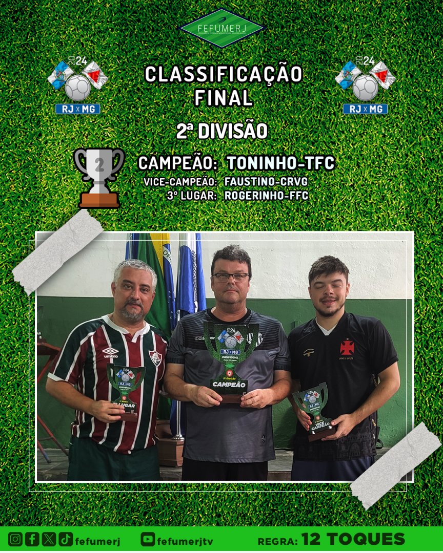 Toninho-MG (Tupi FC) é Campeão 🏆 da 2a Divisão da 1a edição do RJxMG Individual, com o vice campeonato 🥈 ficou Faustinho-RJ (CR Vasco da Gama) e em 3o lugar 🥉 ficou Rogerinho-RJ (Fluminense FC).