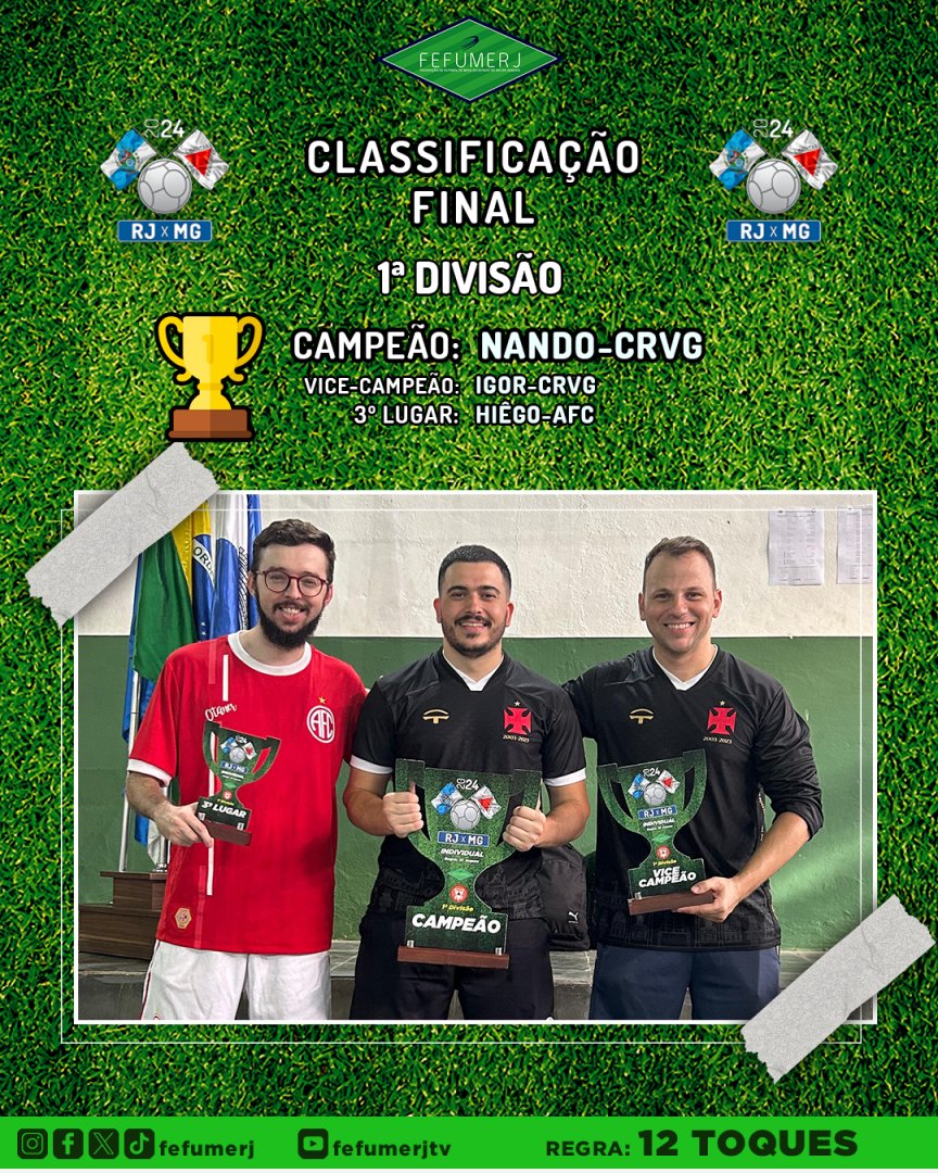 Nando/RJ (CR Vasco da Gama) é o grande Campeão 🏆 da 1a Divisão da 1a edição do RJxMG Individual, com o vice campeonato 🥈 ficou Igor/RJ (CR Vasco da Gama) e em 3o lugar 🥉 ficou Hiêgo/RJ (America FC).