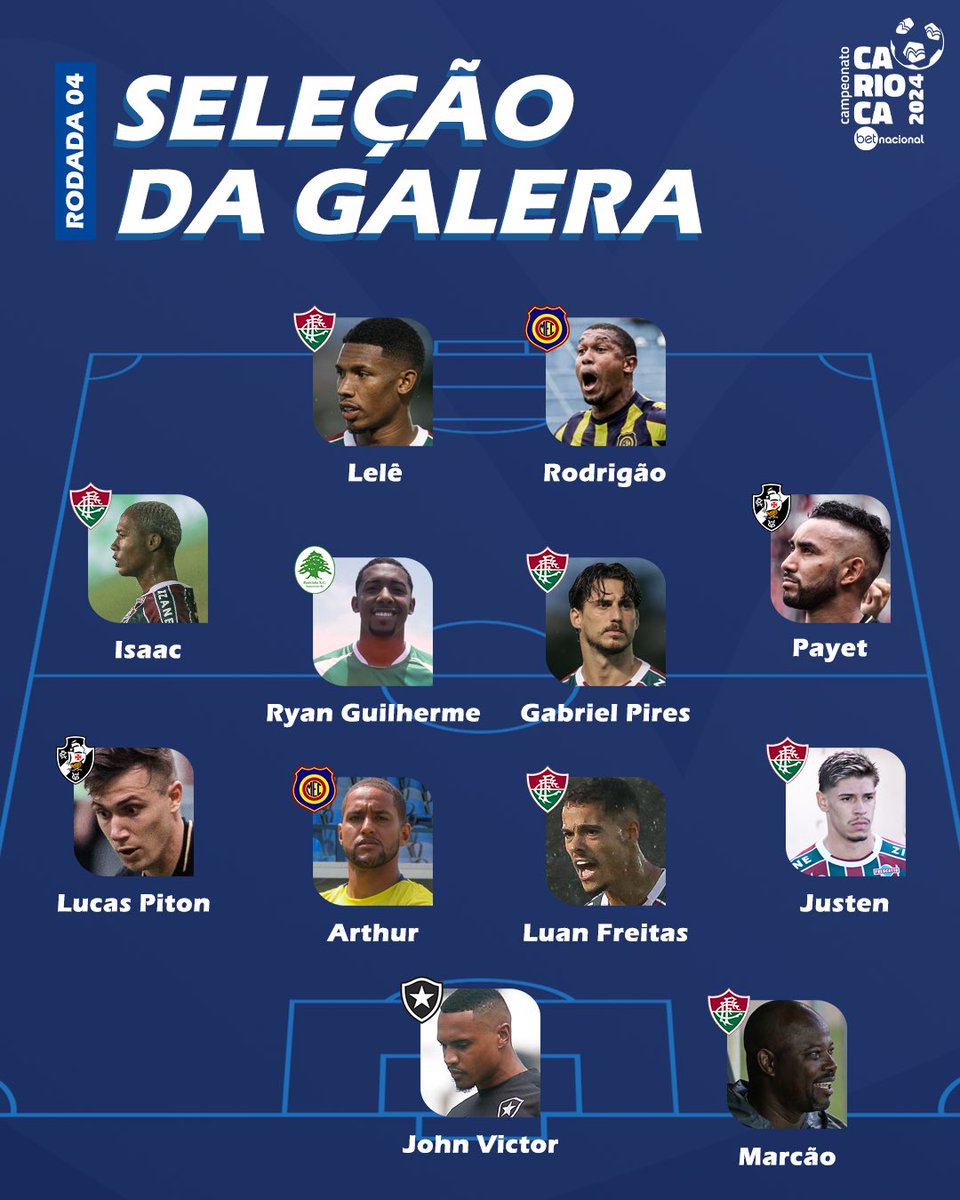 Mais uma vez, a Seleção da Galera está na pista! Nessa quarta rodada, o destaque vai para 5 tricolores além do técnico do @FluminenseFC , que é o líder de momento do #CariocaBetNacional! ⚽️