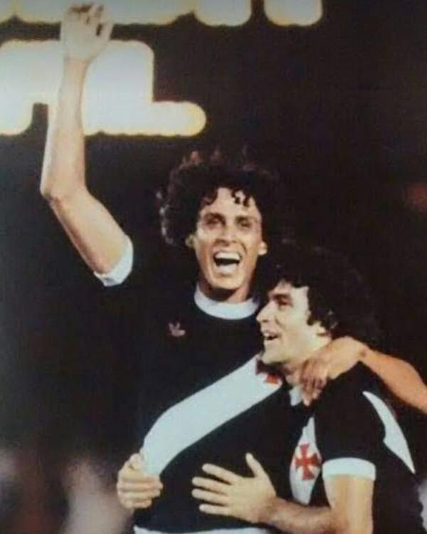 O ídolo Roberto Dinamite abraçando o ponteiro Katinha, comemoração de um dos seus 5 gols na vitória do Vasco da Gama por 5x2 sobre o Corinthians. Partida marcou a volta do grande artilheiro vascaíno ao Maracanã, após passagem pelo Barcelona.