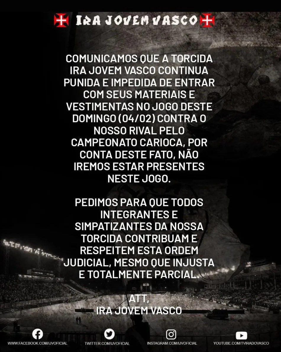 Comunicamos que a Torcida IRA JOVEM VASCO continua punida de entrar com seus materiais e vestimentas no jogo deste domingo (04/02) contra o nosso rival pelo Campeonato Carioca, por conta deste fato, não iremos estar presentes neste jogo.