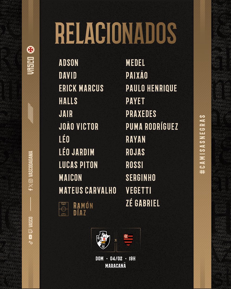Vasco divulga os relacionados para o jogo contra o Urubu; Adson Ă© a novidade