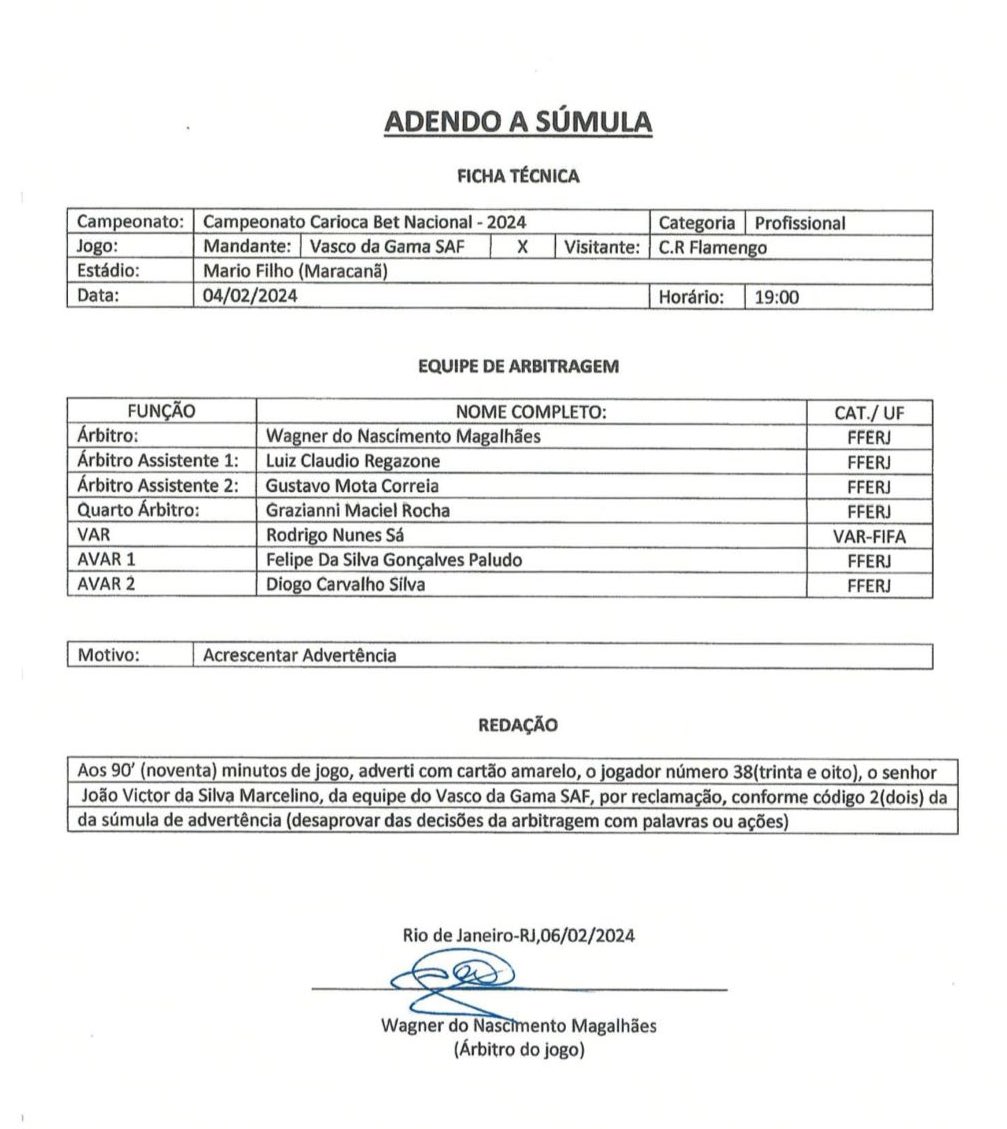 A advertência dada ao jogador está relatada em um 'adendo a súmula' e, por isso, não aparece na primeira lista.
