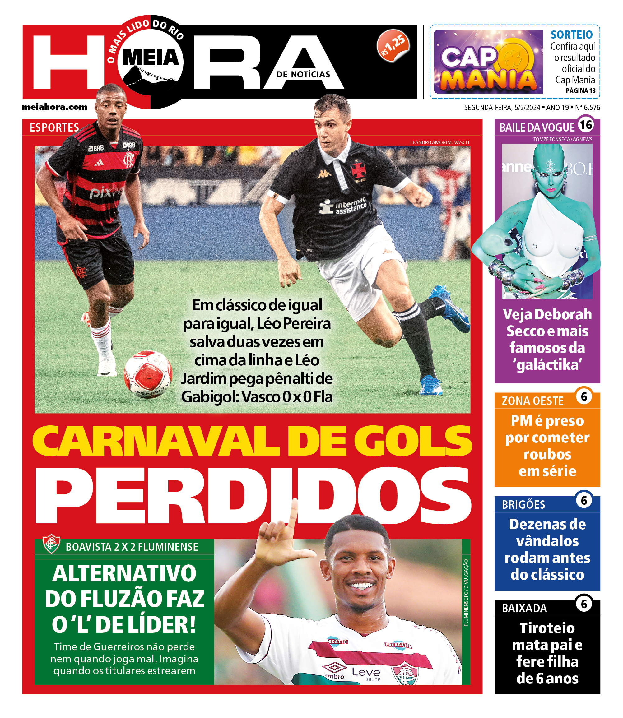 Pelo Campeonato Carioca, Vasco e Flamengo empataram por 0 a 0 no Maracanã, com Léo Jardim defendendo um pênalti cobrado por Gabigol nos minutos finais. Veja as capas dos jornais.