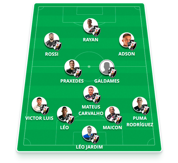 Provável escalação do Vasco: Léo Jardim, Pumita (Paulo Henrique, Rojas), Maicon, Léo, Victor Luis; Mateus Carvalho (Zé Gabriel), Galdames, Praxedes; Rossi (Serginho), Adson e Rayan.