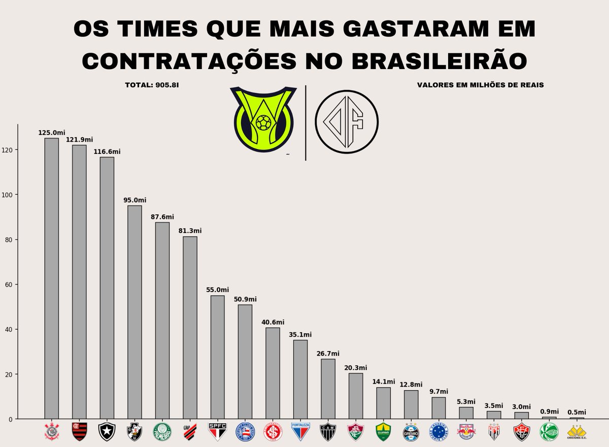 Oito Times acima de 50 Milhões, Seis Times acima de 80 milhões, Três acima de 110 Milhões. Mais de 900 Milhões de Reais investidos! Alguma surpresa? 🤔💰