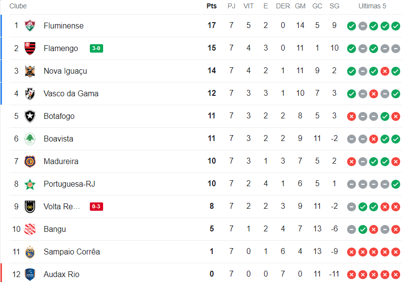 Com o jogo Flamengo 3 x 0 Volta Redonda, da 3ª rodada, realizado neste sábado, agora todos os times da Taça Guanabara têm o mesmo número de partidas: sete. O Vasco está na quarta colocação e, portanto, dentro da zona de classificação para as semifinais do Campeonato Estadual. O Gigante da Colina volta a campo na Quarta-feira de Cinzas, às 21h30, contra o Fluminense, no Maracanã.