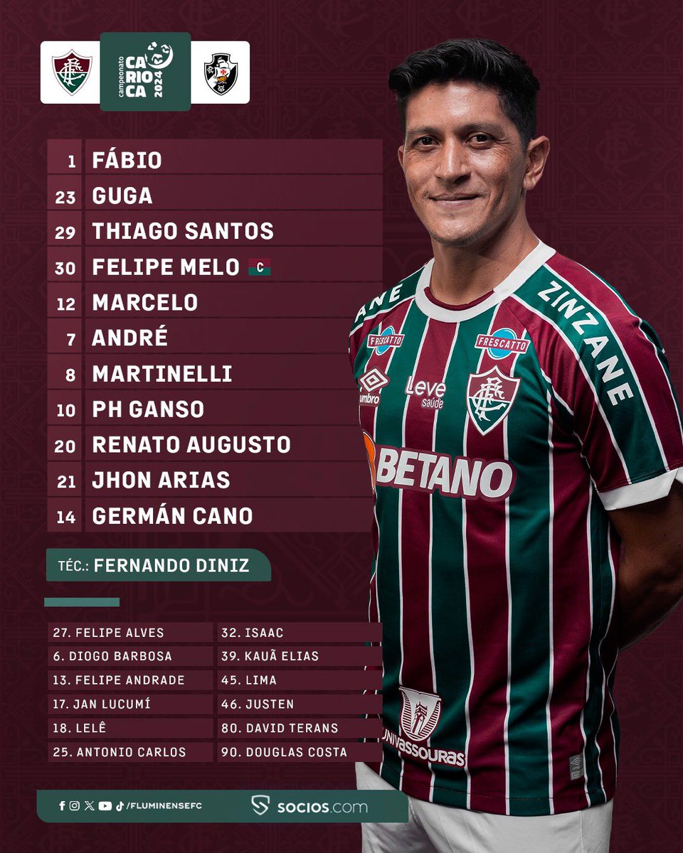 Veja a escalação do Fluminense para o jogo contra o Vasco; ex-vascaínos Fábio e Cano são titulares